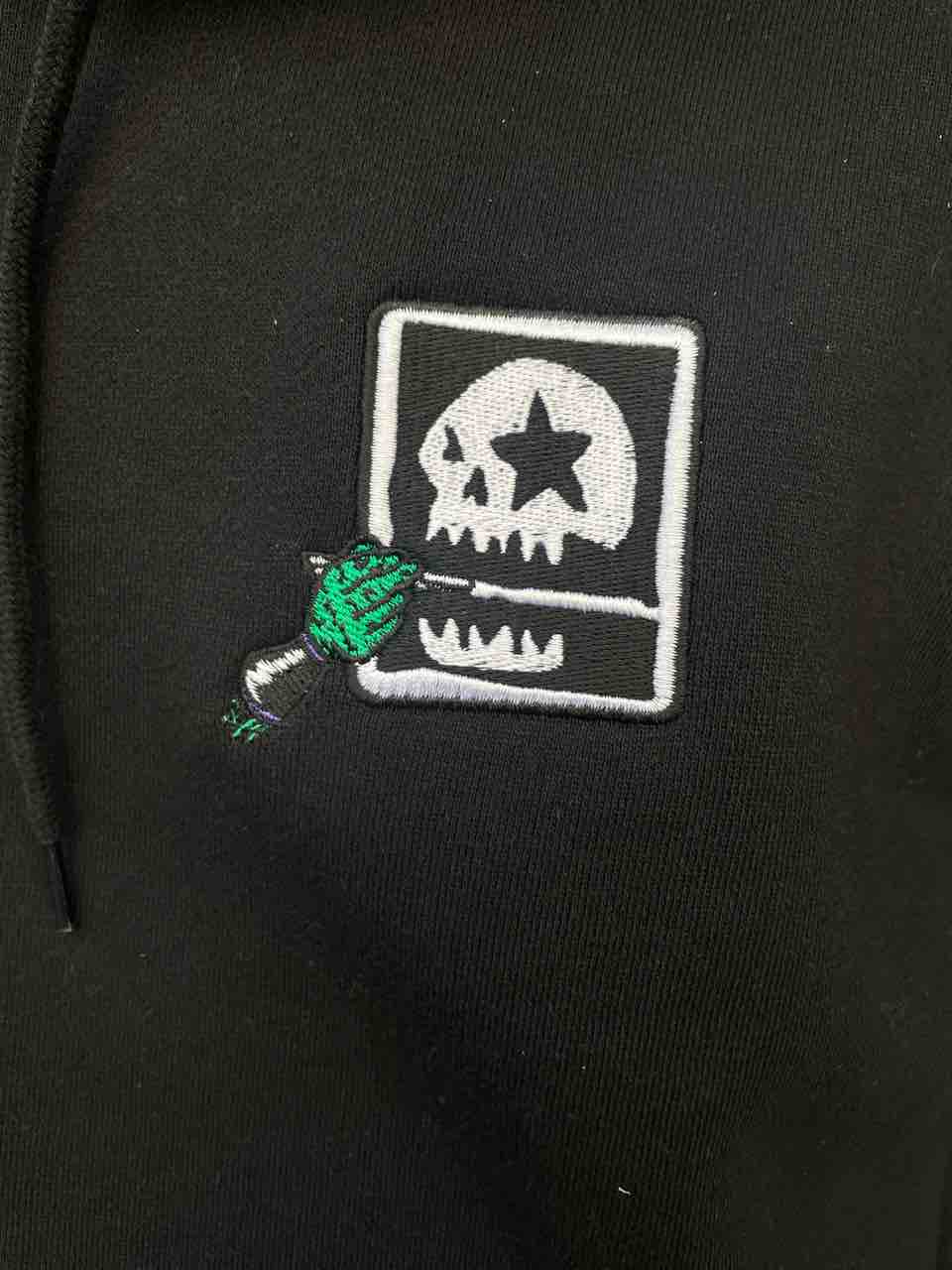 フロントにも割り箸を持っているロビンマスクの手とマモミドクロが胸元に刺繍でデザインされてます💀