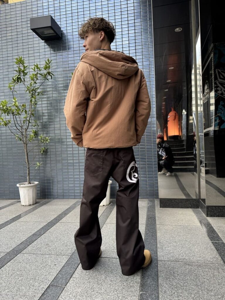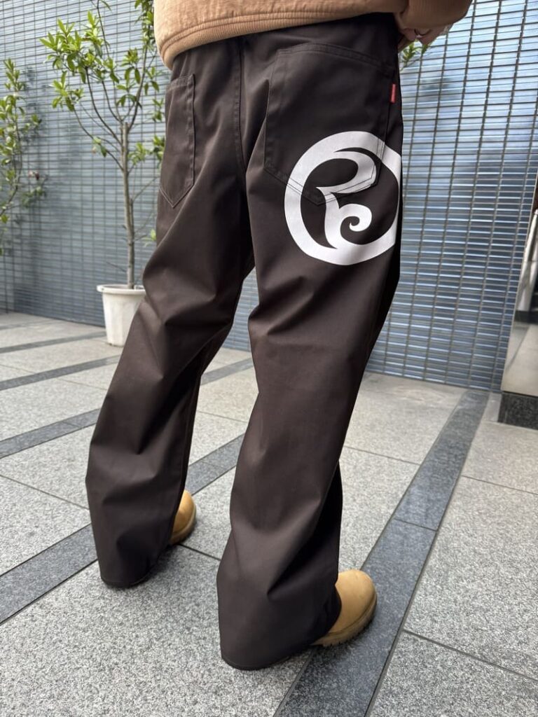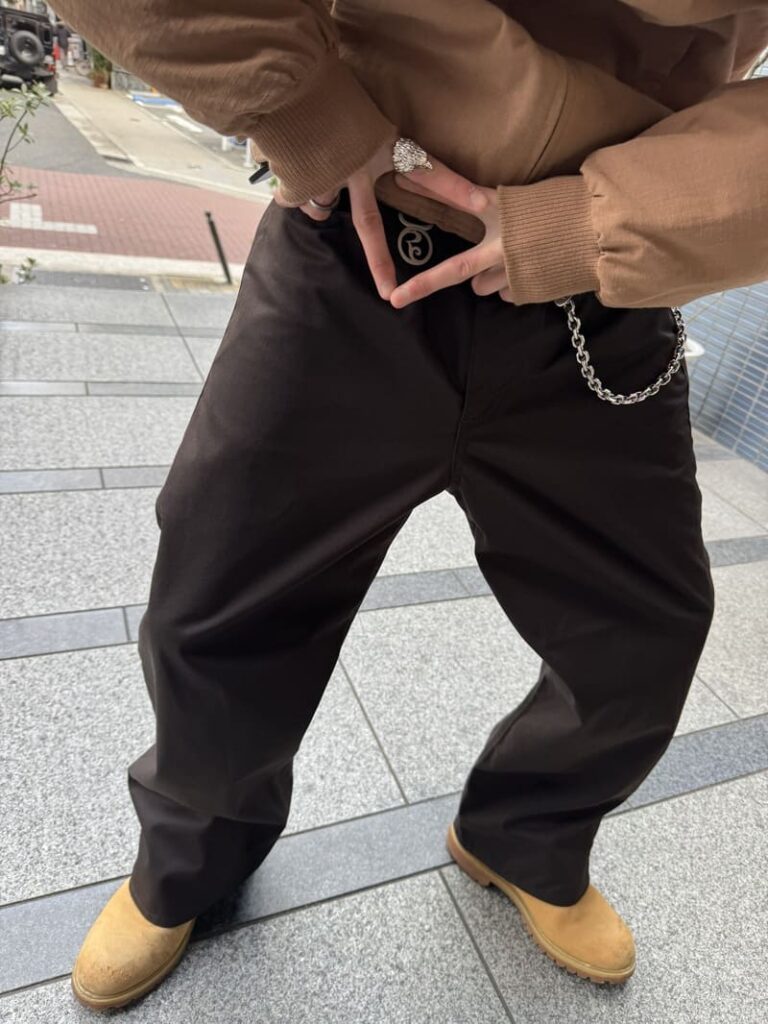 ポリエステルコットンを採用したワイドシルエットのパンツ